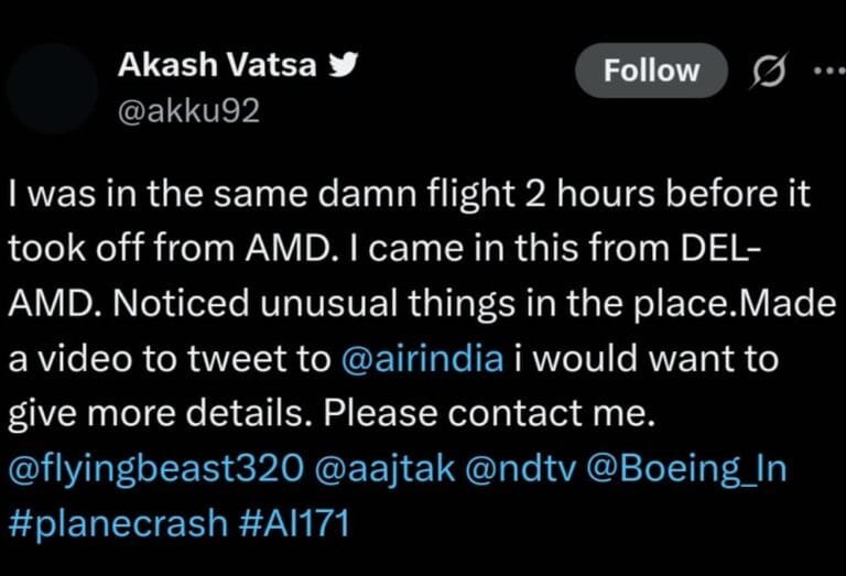 आकाश वत्स के रूप में पहचाने गए यात्री, जो दुर्घटना से ठीक दो घंटे पहले दिल्ली से अहमदाबाद के लिए एयर इंडिया की उड़ान AI171 में यात्रा कर रहे थे, उन्होंने सोशल मीडिया पर अपने चौंकाने वाले अनुभव का विस्तार से वर्णन किया। एक्स (पहले ट्विटर) पर उनका व्यापक रूप से प्रसारित ट्वीट तेजी से वायरल हो गया, जिसने विमान में संभावित पहले से मौजूद समस्याओं पर ध्यान आकर्षित किया। वत्स के पोस्ट, जिसमें वीडियो भी शामिल थे, में कहा गया था, “मैं उसी फ्लाइट में था, एएमडी से उड़ान भरने से 2 घंटे पहले। मैं इसमें डीईएल-एएमडी से आया था। प्लेन में कुछ असामान्य चीजें देखीं।”